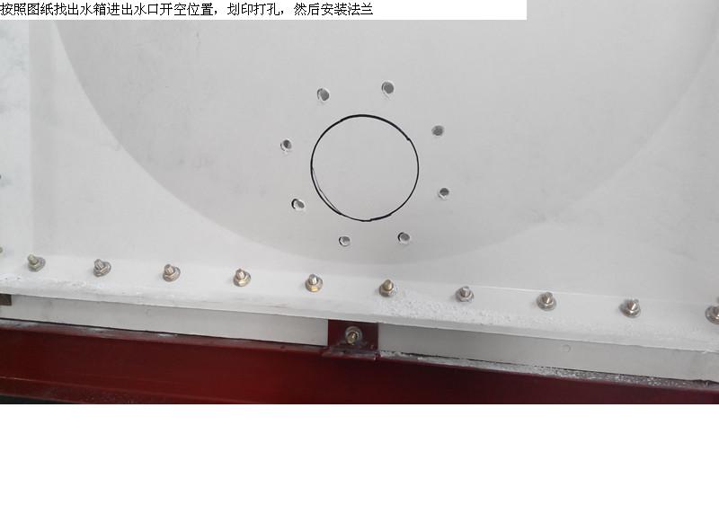 玻璃鋼水箱步:按照客戶提供的圖紙找出進水、出水、溢流、排污、氣孔的開口位置,畫上印作為標記,然后找準法蘭的角度與水箱板之間的凸面位置,放準為好,用鉛筆畫上印,在對準法蘭的螺栓口進行打孔,如以下示意圖: